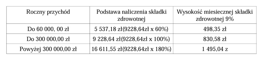 1.Składka zdrowotna stanowi 9% od dochodu dla zasad ogólnych oraz 4,9% od dochodu dla podatku liniowego za miesiac poprzedni.